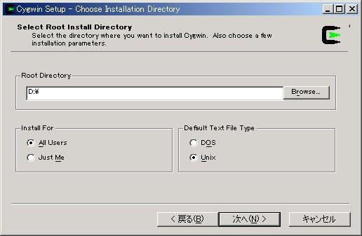 3.下記の画面が表示されたら、ROOTディレクトリを決めます。Dドライブがある場合は、D:\ Cドライブの場合は C:\としてください。 All usersとUnixをチェックして、「次へ」をクリックします。